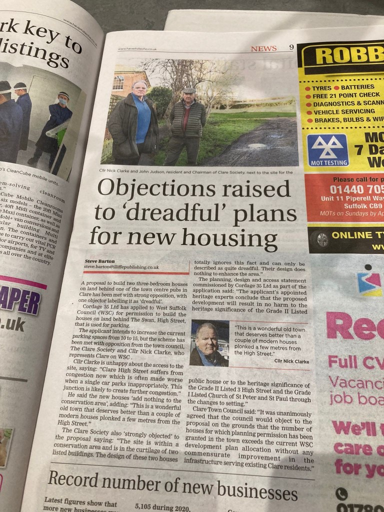 The Haverhill Echo picked up my blog post about the proposed development to the rear of the Swan Inn in Clare.