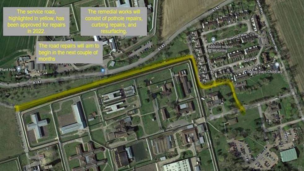 Today I received an email updating me on the roads. These roads are managed as part of the everyday running of the prison and, after a tender process, the MoJ can confirm the service road repairs will begin over the next couple of months with firmer dates to be provided in the next couple of weeks. Please see the site map below, with the proposed area of repairs annotated.