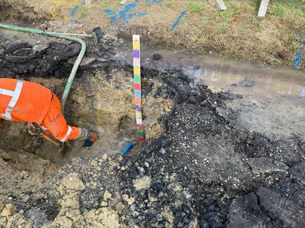 Interestingly, the tarmac and road structure appears not very thick here with most of what was extracted being mud. Because a lot of water has been swilling around there is a concern that the road may be damaged beyond the existing hole. This will need to be assessed by a road engineer hopefully on Monday. Full repairs to the road will then be made. The road will remain closed until this work has been carried out.