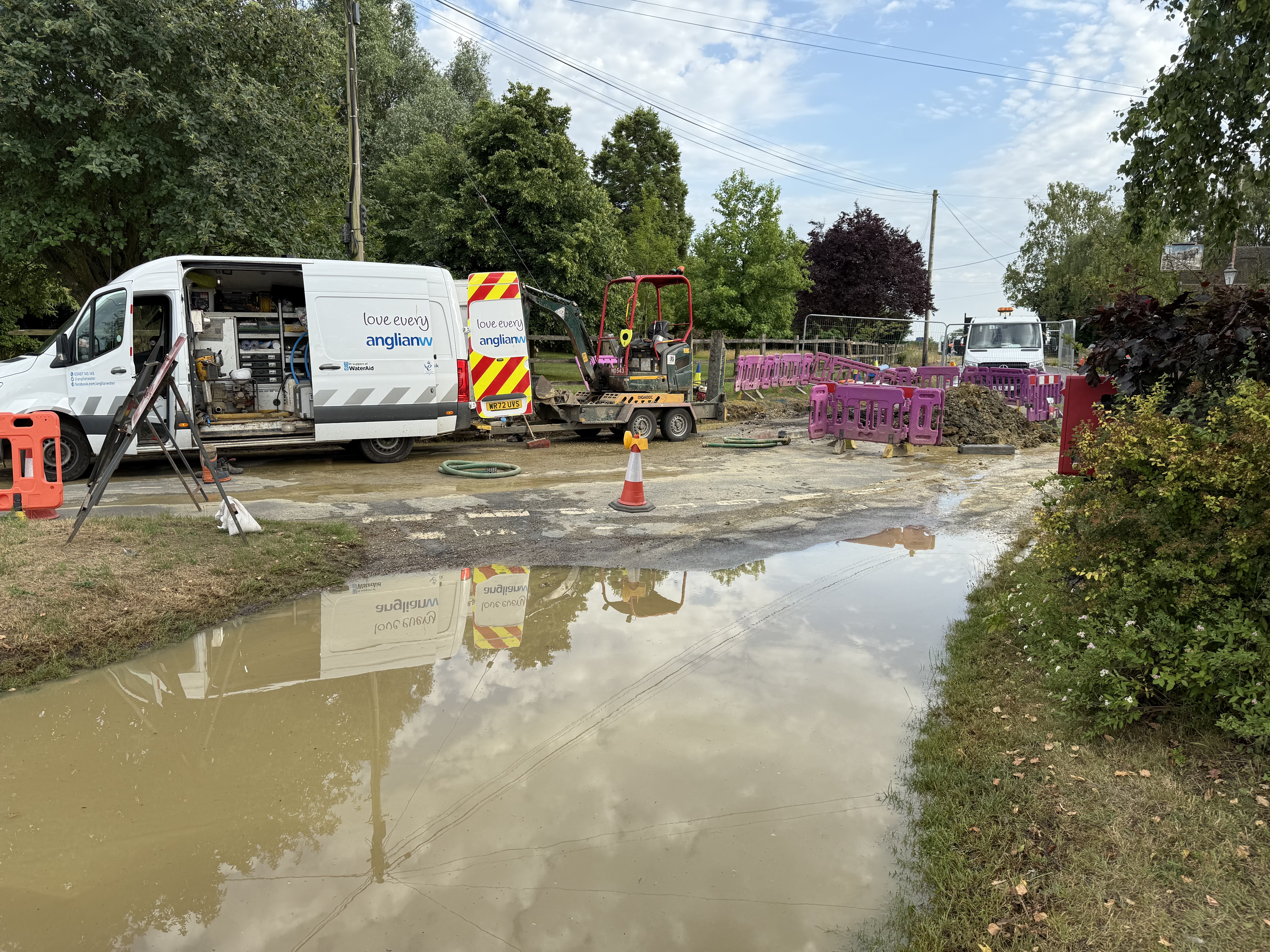 Anglia Water sent a team from Norwich today, to repair it. The road has been closed all day (although a few folk slipped by first thing this morning), and the road has been dug up. They found a branch of the mains to the Plough had “blown off”.